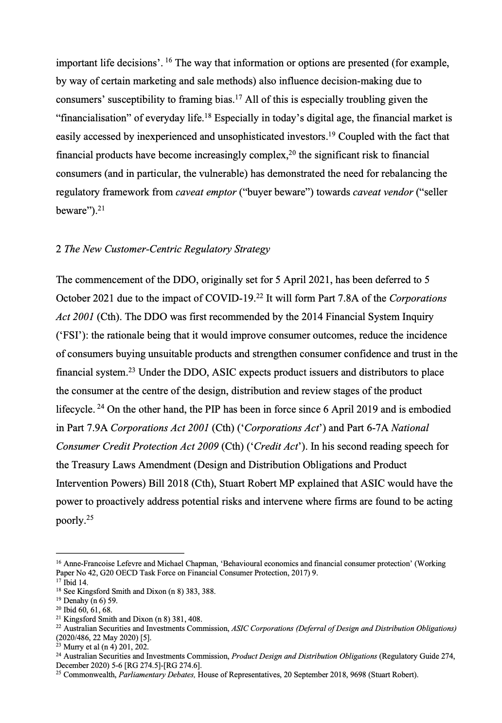This paper provides an overview of the Australian DDO and PIP, including the background, tests and requirements that will be imposed on financial product issuers and distributors. As part of this overview, the paper will make comparisons to the United Kingdom’s (‘UK’) product governance regime. By drawing from the UK experience, and submissions made by industry players in response to the Australian proposal, the paper will explore the practicalities and potential shortcomings in the Australian regime as it currently stands.